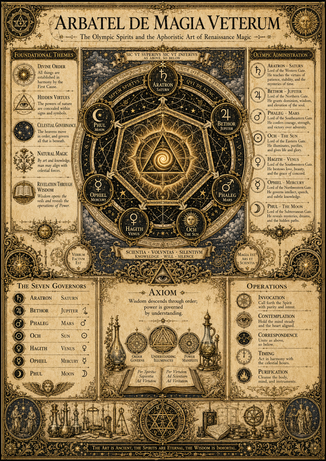A manuscript reference folio that maps Arbatel de Magia Veterum's governing ideas, symbolic structure, practical uses, and comparative context into one museum-style manuscript page.