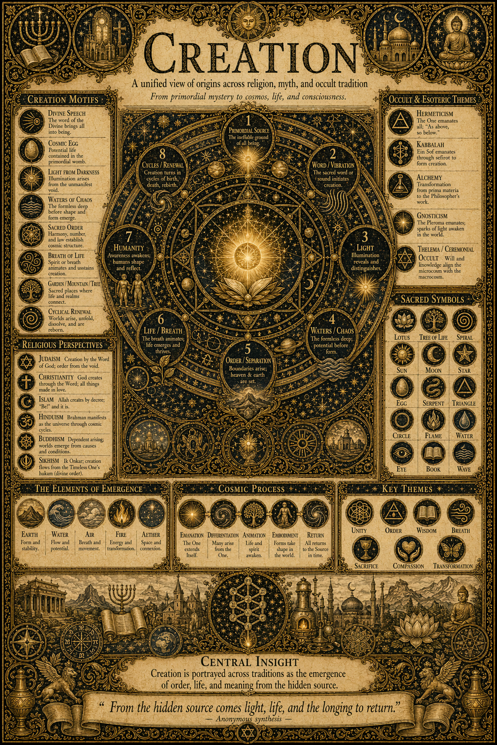 A manuscript reference folio that maps Creation's governing ideas, symbolic structure, practical uses, and comparative context into one museum-style manuscript page.