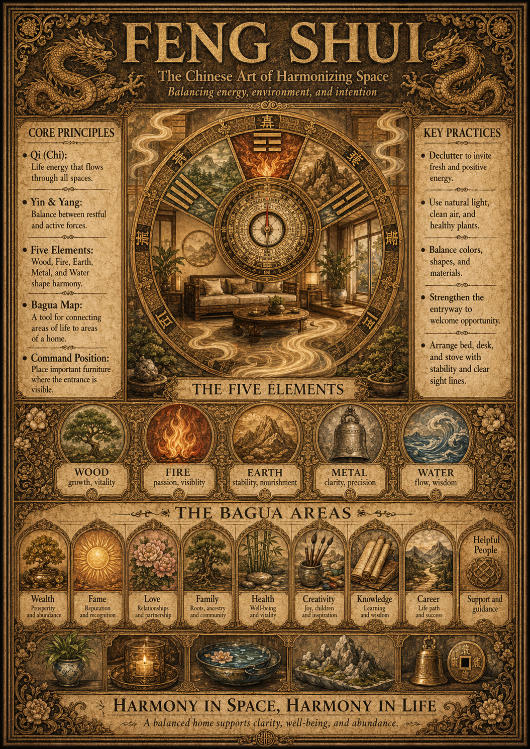 A manuscript reference folio that maps Feng Shui's governing ideas, symbolic structure, practical uses, and comparative context into one museum-style manuscript page.